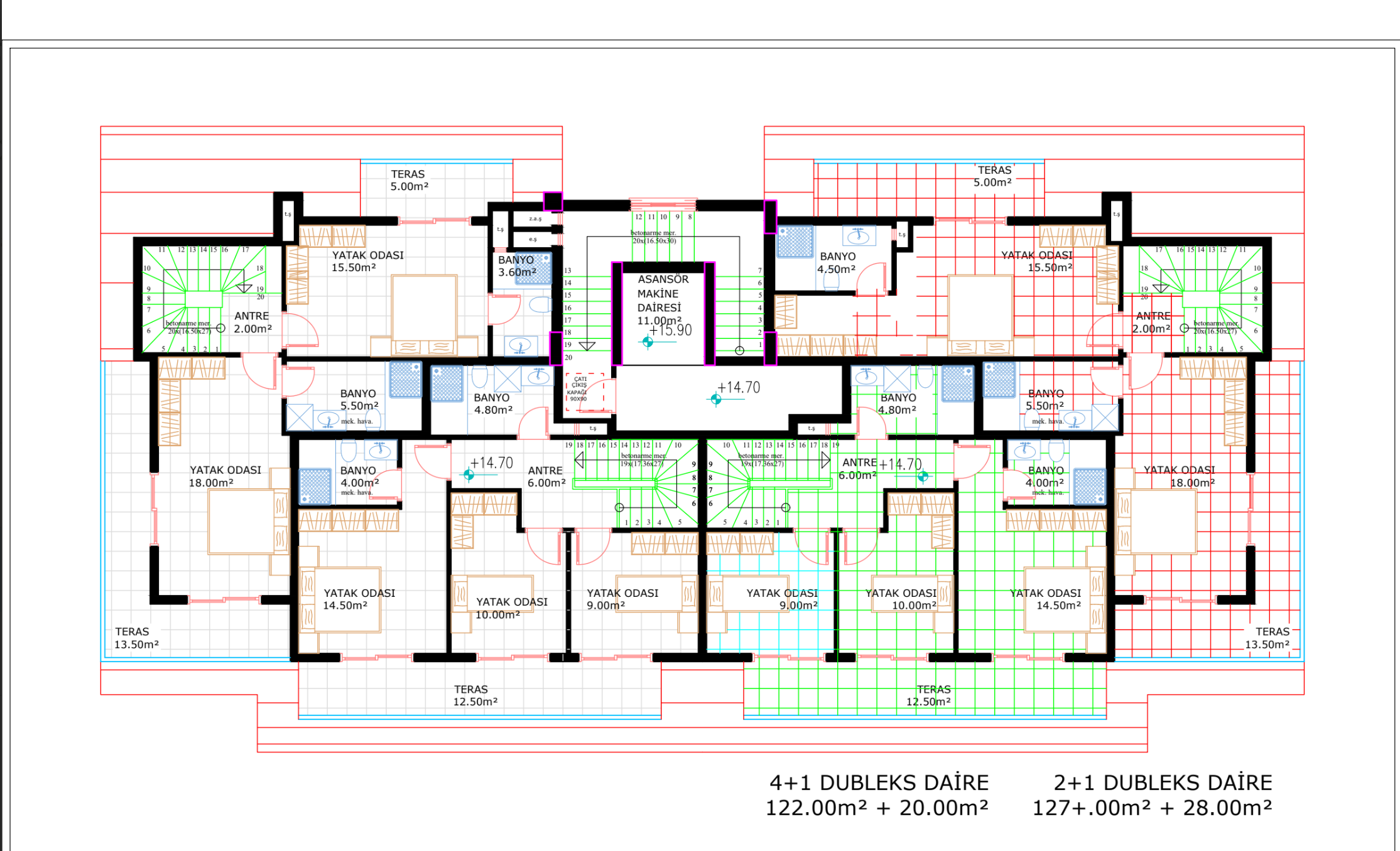 und im 4 Stockwerk beginnend dann die Wohnungen. Praktisch hat man vierten und 5 Stockwerk innerhalb der Wohnung eine Treppe wo man rauf kann Zum 5 Stockwerk zur Dachgeschoss Ebene welche auch Dachterrassen beinhalten alle Wohnungen haben mindestens 2 Bäder einige Wohnungen haben 3 WCs (siehe Pläne)